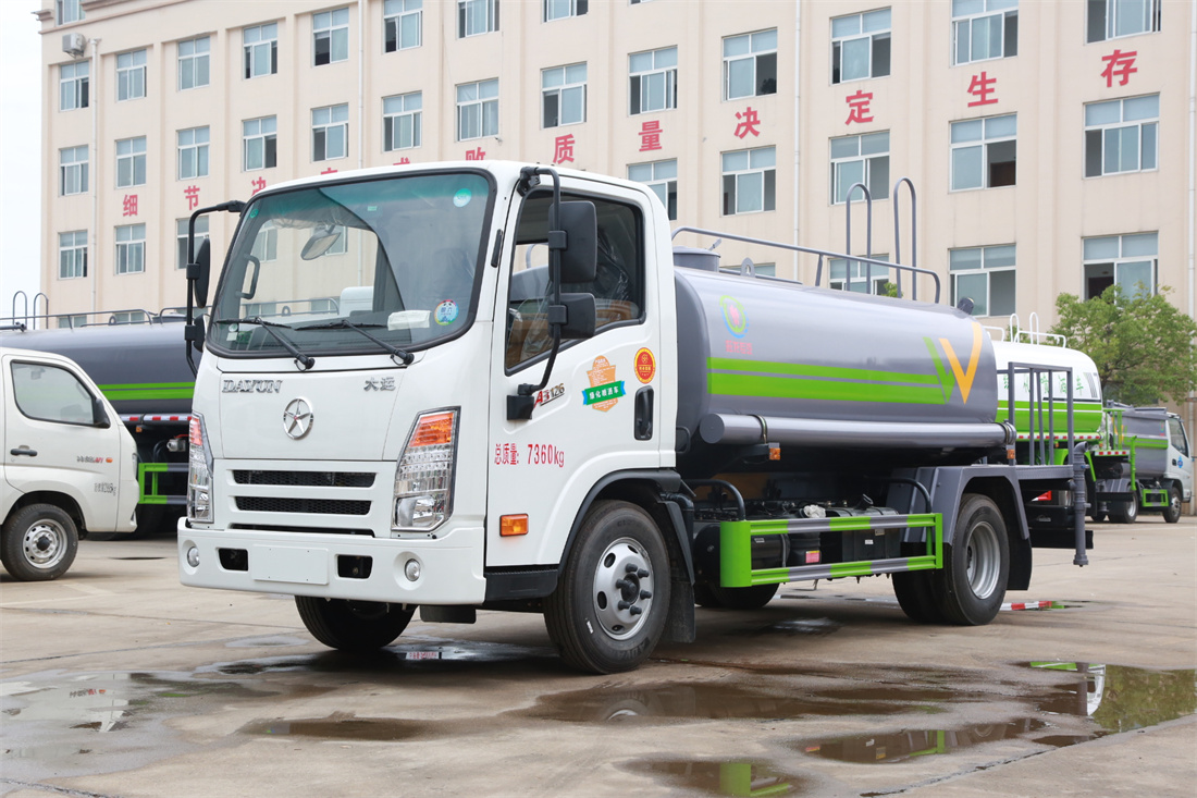 灑水車前裝有鴨形噴嘴或圓頭沖嘴,后面裝有圓柱開灑水噴嘴或蓮蓬頭噴嘴,后部有一工作平臺(tái),裝配有水炮。后部還可裝8個(gè)噴嘴(選裝)。