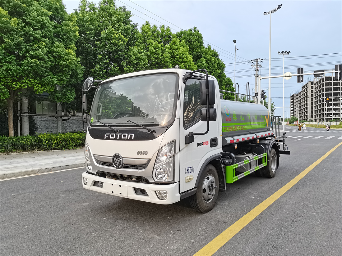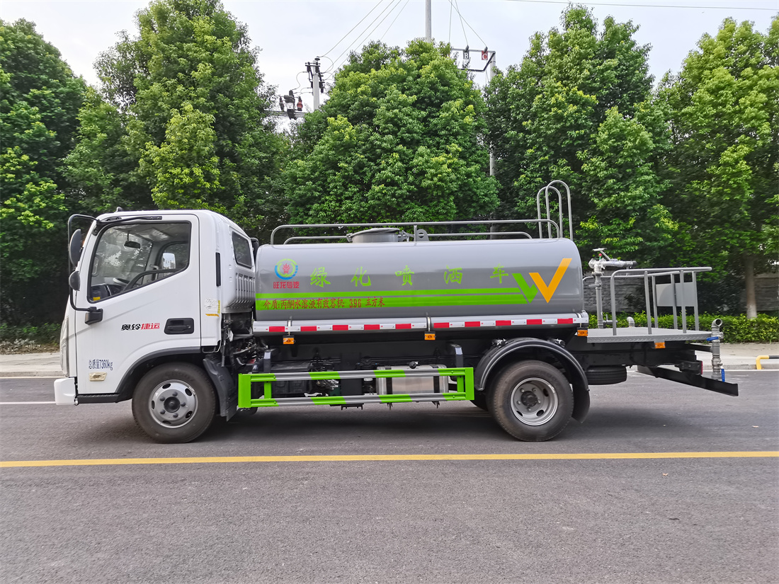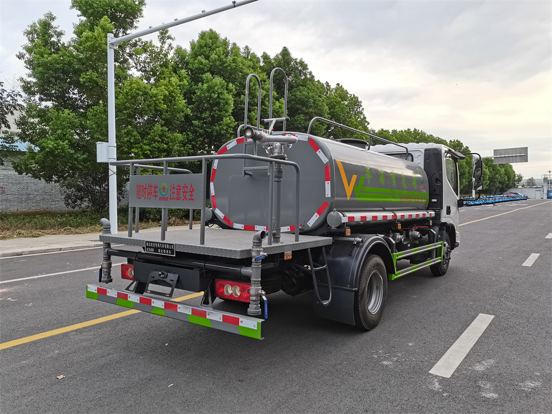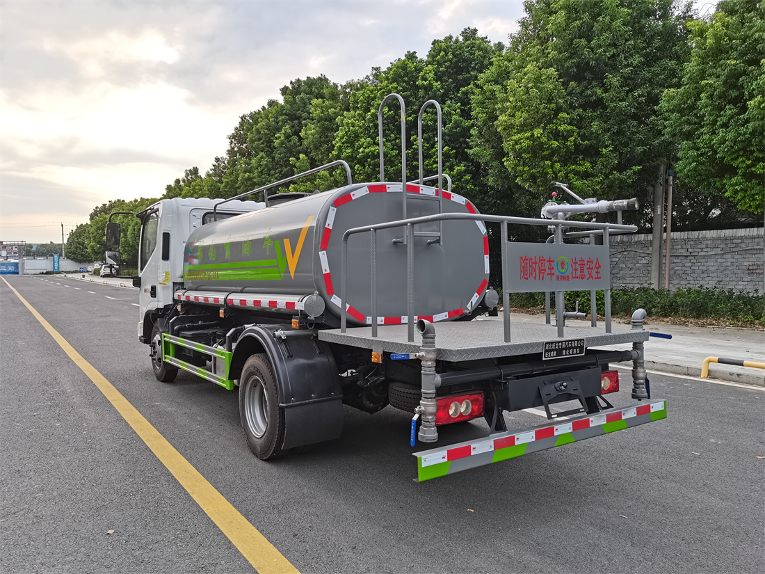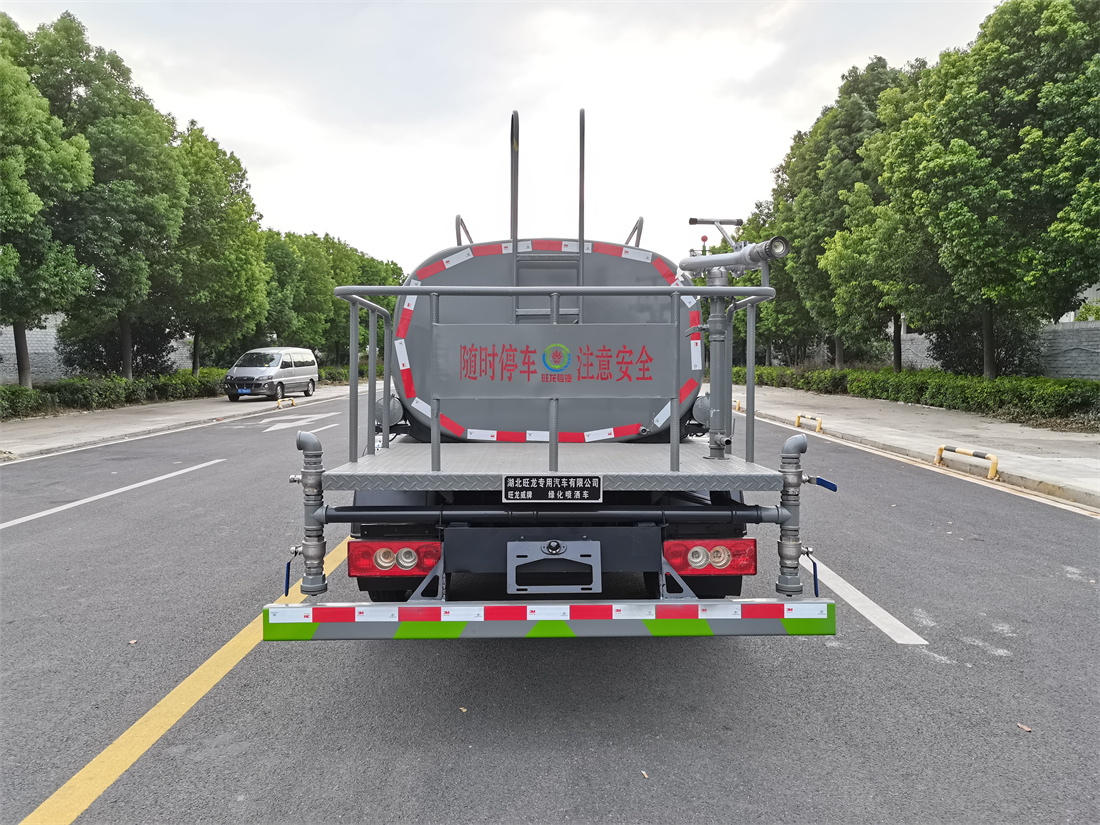 灑水車前裝有鴨形噴嘴或圓頭沖嘴,后面裝有圓柱開灑水噴嘴或蓮蓬頭噴嘴,后部有一工作平臺,裝配有水炮。后部還可裝8個噴嘴(選裝)。