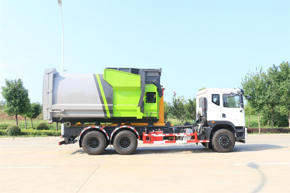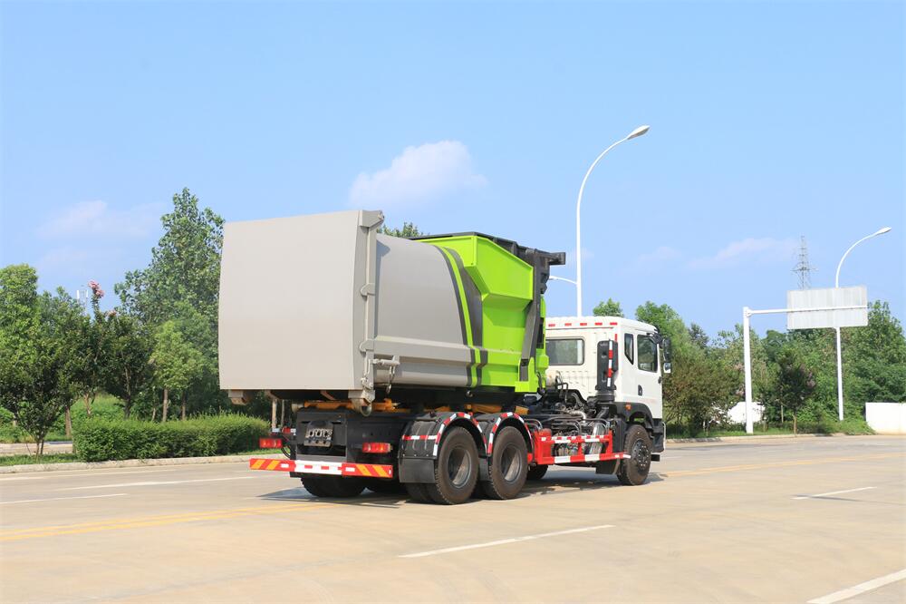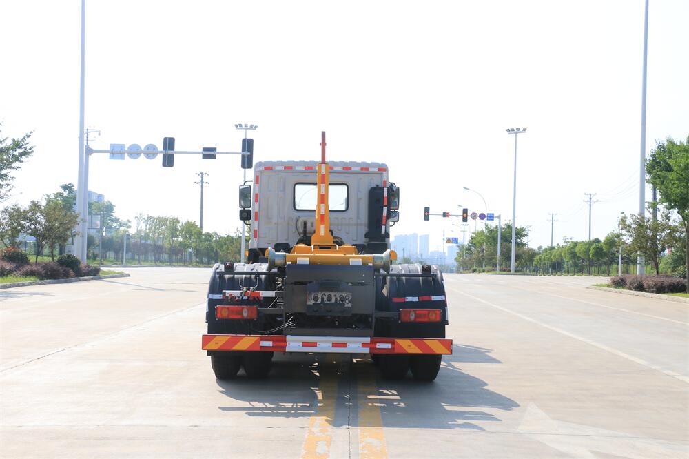 勾臂式垃圾車(車廂可卸式垃圾車)介紹: 車廂可卸式垃圾車又叫拉臂式垃圾車,是一種采用高新設計可伸縮的鉤臂,實現垃圾廂的二次吊裝,自吊上放下,可自行傾倒垃圾的環衛設備。 拉臂式垃圾車結構簡單,操作穩定方便,裝卸效率高,機械化程度高,節省人力。鉤臂垃圾車一車可帶多個垃圾廂,在裝卸的運輸過程中可有效地避免二次污染。 拉臂垃圾車采用高新設計可擺動的鉤臂,垃圾箱由框架、開啟油缸、滑輪、后門和若干加強框架與鋼板焊接而成。調換貨廂快捷方便,貨廂上帶蓋(倒垃圾時可翻開),鉤臂垃圾車垃圾廂體可選用碳鋼、不銹鋼材質、內部采取環氧樹脂防腐處理,改裝部分與原車底盤為可分離式,維修方便且保持了原車的機動性及行駛性能。