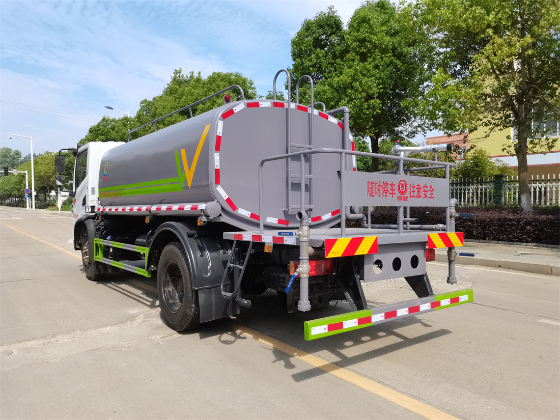 灑水車前裝有鴨形噴嘴或圓頭沖嘴,后面裝有圓柱開灑水噴嘴或蓮蓬頭噴嘴,后部有一工作平臺(tái),裝配有水炮。后部還可裝8個(gè)噴嘴(選裝)。