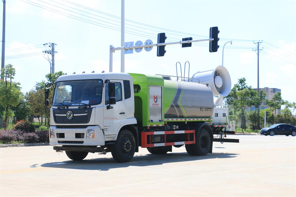 上裝配置:罐體容積為 12立方,選配風送式霧炮機組射程30米、40米、50米、60米、80米、100米、120米霧炮,罐體鋼板為4mm碳鋼Q235材質,罐內隔板具有防波作用,以減輕汽車行駛時罐體液體沖擊,罐體及整車外形尺寸按照公告。帶大功率專用灑水泵,泵可自吸自排,整車前沖、后灑、側噴、帶65消防接口,后平臺配CLW-50、CLW-60、CLW-80、CLW-100、CLW-120型風送式霧炮機組;罐體前封頭配大功率柴油發電機組;前封頭帶水位計,后平臺主管路帶1寸澆花接口,后爬梯。帶兩根輸水管及陰陽端。罐體顏色:銀/灰/綠,罐體兩側噴“多功能抑塵車”字樣,貼反光標示。