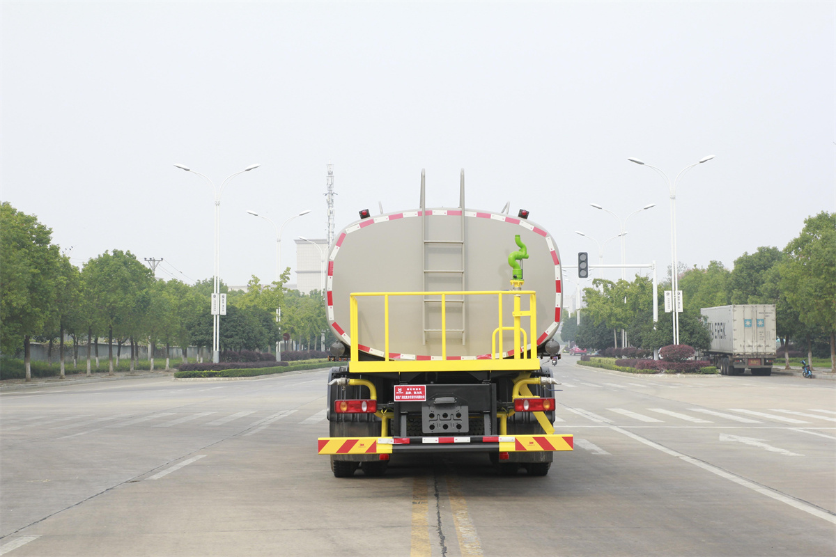 灑水車前裝有鴨形噴嘴或圓頭沖嘴,后面裝有圓柱開(kāi)灑水噴嘴或蓮蓬頭噴嘴,后部有一工作平臺(tái),裝配有水炮。后部還可裝8個(gè)噴嘴(選裝)。